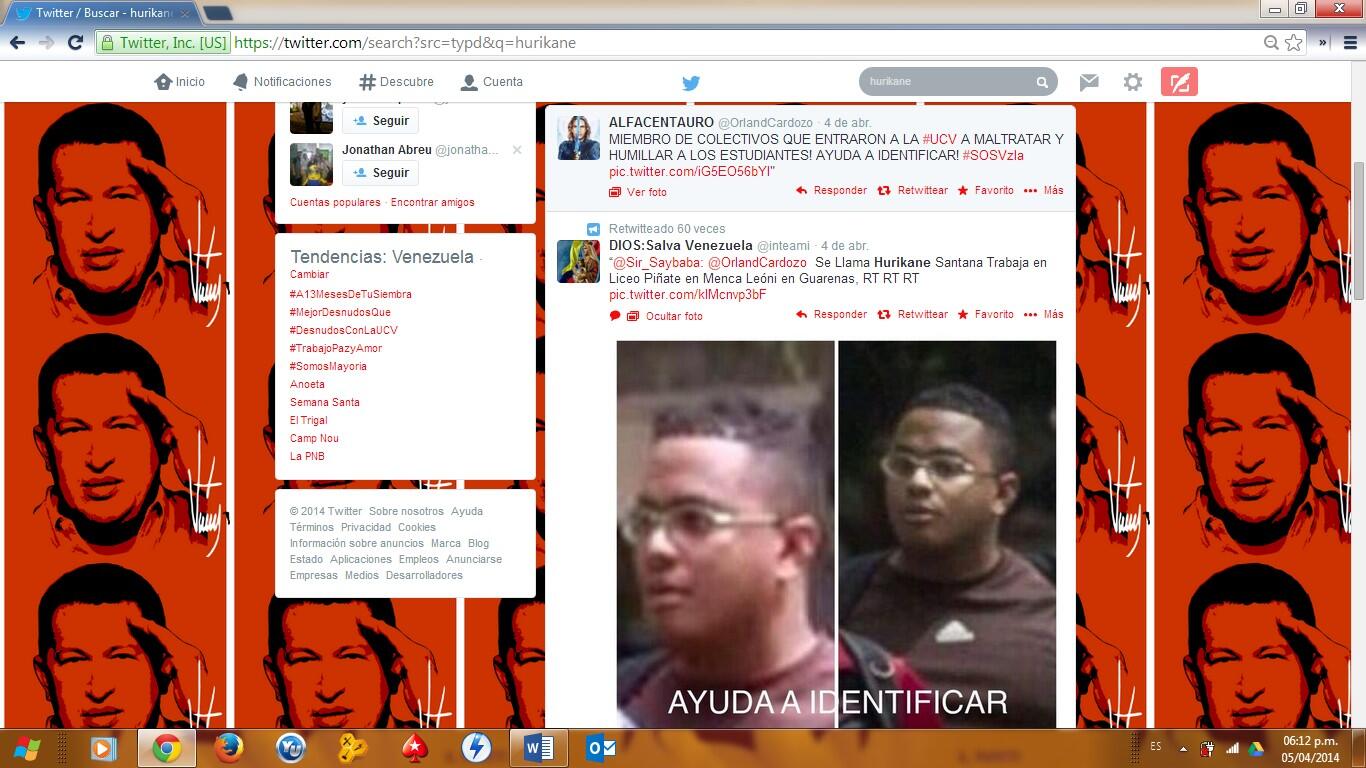En este mensaje enviado por un de estos " Paci-fascistas" de la derecha se pretende vincular al profesor hurikane santana, integrante del Colectivo Al Pie del Cañòn como participante en los recientes disturbios de la ucv, ! cosa mas ridícula!. desde aqui manifestamos públicamente el apoyo en pleno al camarada Hurikane y de igual manera no un llamado, mas bien una advertencia a la Rectora de esa Casa que " Esta siendo vencida por las Sombras " que sea seria y de la cara como responsable de estas situaciones